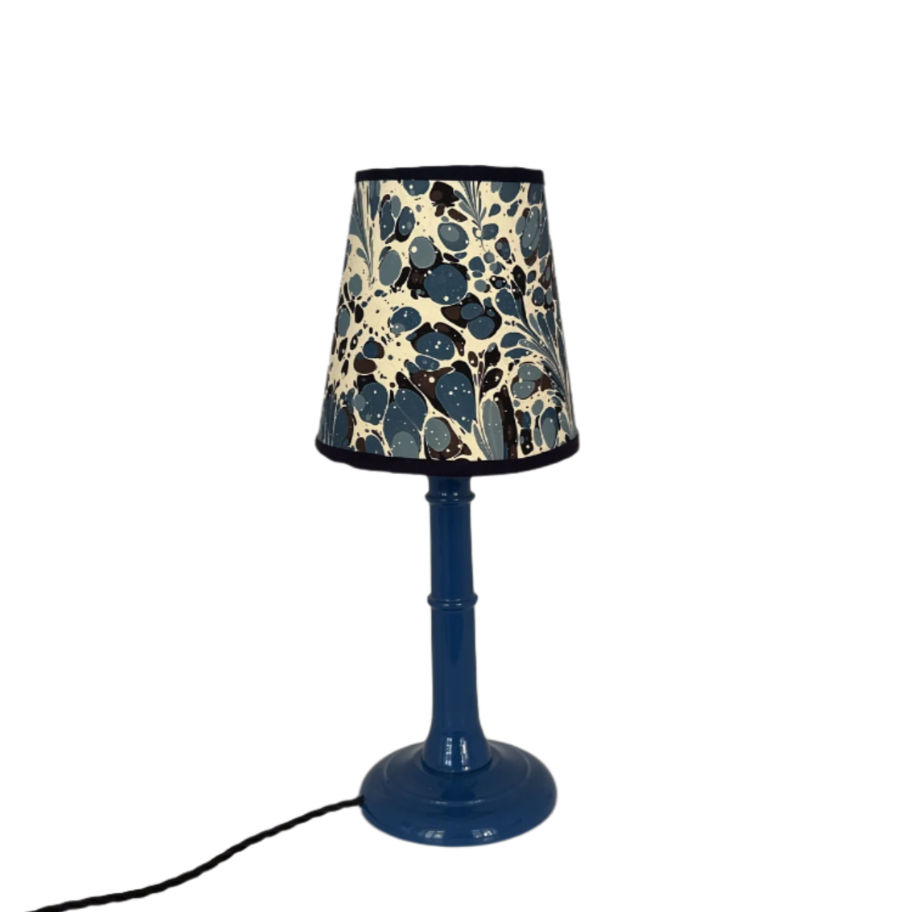 The marbled paper is handmade by Jemma Lewis. The lampshade is lined with cream card and is finished with a matching navy cotton trim.