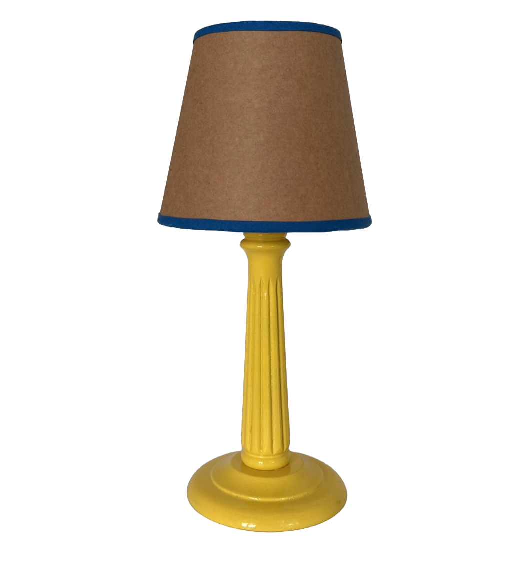 The lampshade is made with brown paper, lined with cream card and is finished with a blue cotton trim.