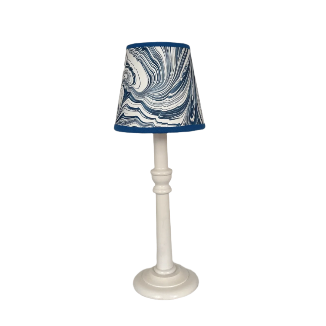 The marbled paper is handmade by Jemma Lewis. The lampshade is lined with cream card and is finished with a bright blue cotton trim.